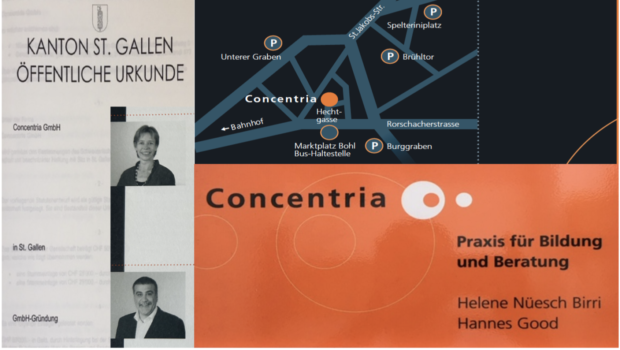 Nach mehrjähriger Zusammenarbeit als Praxisgemeinschaft haben Helene Nüesch und Hannes Good Anfang 2006 entschieden, eine gemeinsame Firma zu gründen. Im August 2006 erfolgte der Eintrag ins Handelsregister. Die Concentria GmbH l Praxis für Bildung und Beratung war geboren.